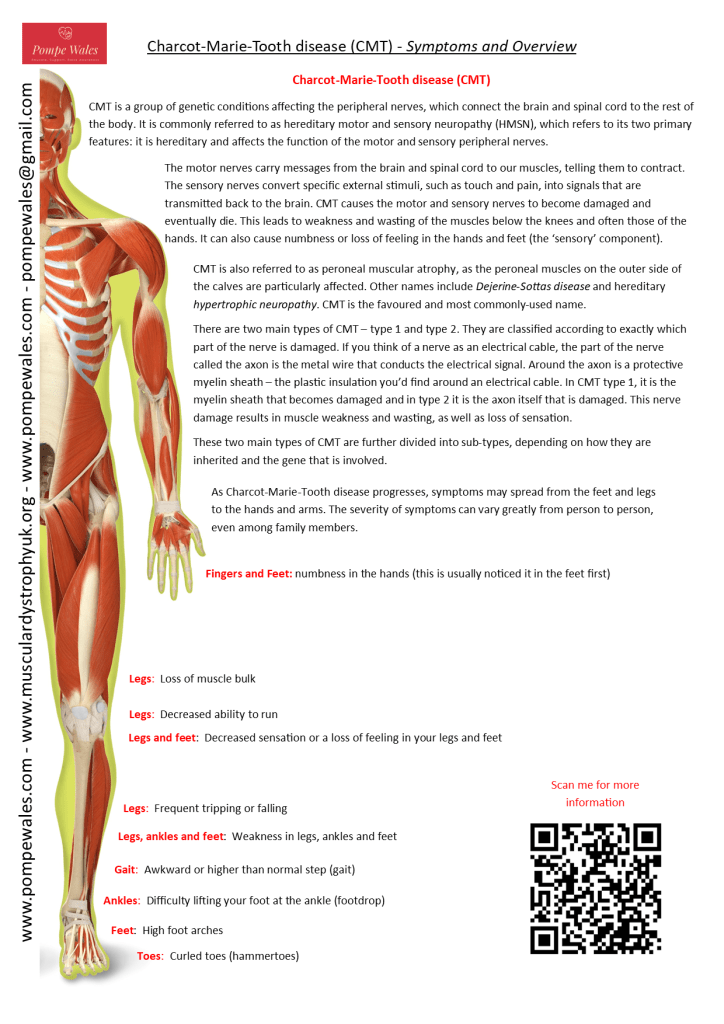 CMT is a muscular dystrophy that affects 1 in 2,500 people and although a rare disease is the most common inherited peripheral neuropathy. It is a group of genetic conditions affecting the peripheral nerves, which connect the brain and spinal cord to the rest of the body. It is commonly referred to as hereditary motor and sensory neuropathy (HMSN), which refers to its two primary features: it is hereditary and affects the function of the motor and sensory peripheral nerves.