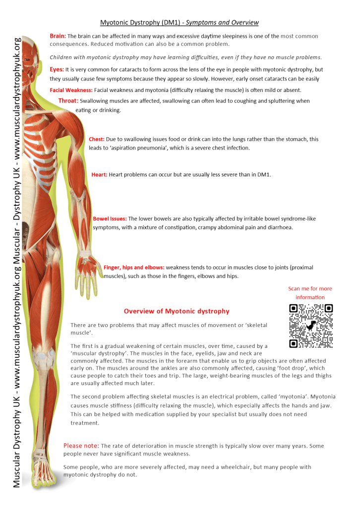 The second problem affecting skeletal muscles is an electrical problem, called ‘myotonia’. Myotonia causes muscle stiffness (difficulty relaxing the muscle), which especially affects the hands and jaw. This can be helped with medication supplied by your specialist but usually does not need treatment.