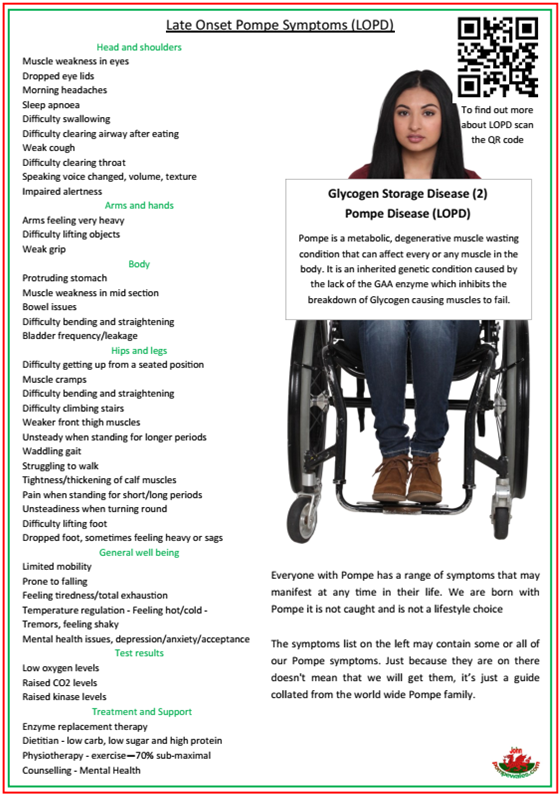 The symptoms of Late Onset Pompe Disease (LOPD) are listed below.